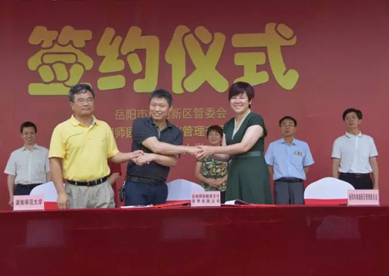 7月1日,湖南师范大学附属南湖学校合作办学项目签约仪式在南湖新区举行,岳阳市南湖新区工委副书记、管委会主任雷欣、湖南师范大学副校长王善平、岳阳师园教育文化管理有限公司董事长俞毅分别代表三方签字。岳阳市领导陈志莲、李为、方争奇及南湖新区工委书记李运帷、岳阳市教体局党组书记、局长王德华等有关部门领导出席。
