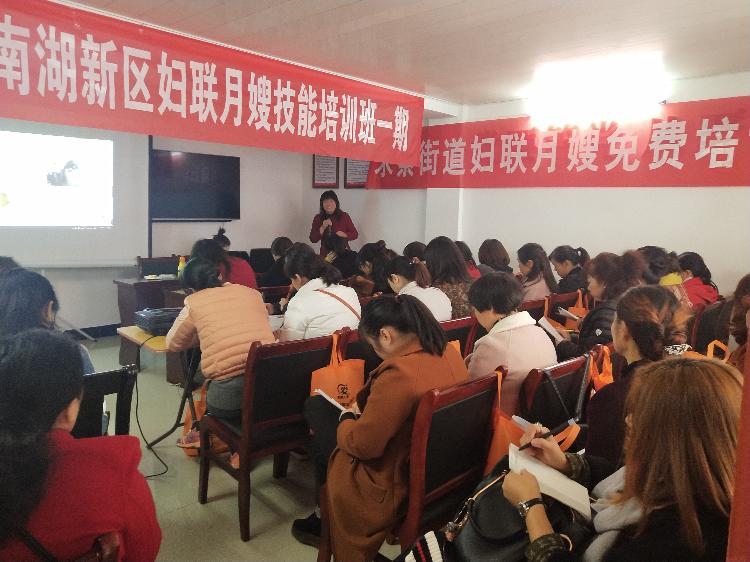 由南湖新区妇联主办、求索街道妇联承办的第一届月嫂技能免费培训班,在湖畔社区会议室爱心开课。“爱婴天使”月嫂培训学校老师周桂春领衍主讲,社区50名准奶奶、准妈妈及有意从事月嫂职业的妇女参加。