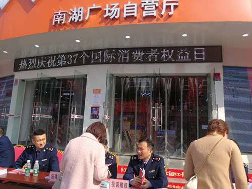 (通讯员周颖) 3月15日上午,南湖新区消费者协会、南湖工商分局、联合南湖食药分局、市华润燃气、长沙银行南湖支行、盐业公司、烟草公司、酒类行业协会、爱尔眼科等7家单位,在中国联通南湖营业部楼前举办了以“信用让消费更放心”为主题的“3.15”国际消费者权益日大型现场咨询服务活动。岳阳市市场监督管理局党组书记、局长提名人选许平亚在南湖工商分局局长徐宁的陪同下亲临活动现场巡视指导。