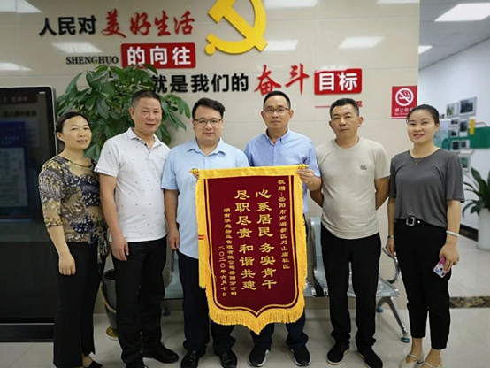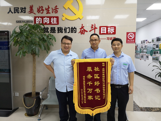 “感谢社区所有的工作人员和党员志愿者们,谢谢你们长期以来对岳州帝苑小区的关心和帮助。”6月18日上午,岳州帝苑小区华庭物业公司代表将一面印着“心系居民务实肯干,尽职尽责和谐共建”的锦旗与一面印着“社区好书记,服务千万家”的锦旗送到南湖街道刘山庙社区,感谢社区在疫情防控工作中为小区的平安所付出的艰辛和努力。