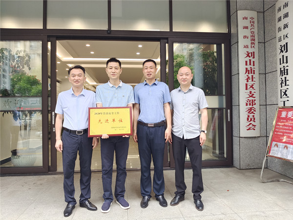 6月10日,南湖新区食安办举行2020年度食品安全先进集体和个人颁奖仪式,区食安办主任徐宁分别为南湖街道和南湖街道工委副书记向钟颁发奖牌。