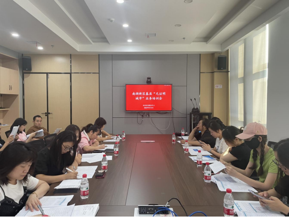 培训会上,工作人员简要介绍了创建“无证明城市”的概念、工作目标和要求,解读了街道(管理处)、社区(村)证明事项清单,新点公司工程师指导基层政务专干就通过南湖新区“一网通办”平台开具各类证明、协助指导群众通过岳办岳好APP和小程序实现证明事项的在线申报等,做了详细讲解。