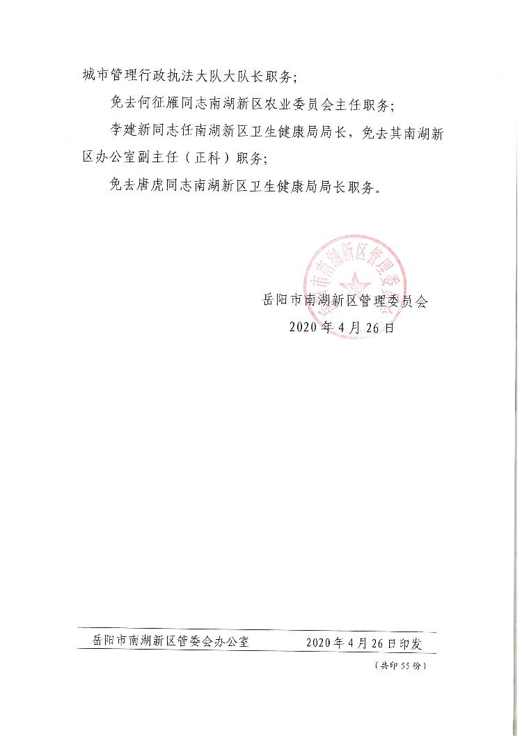 岳阳市南湖新区管委会关于毛晋锋等同志职务任免的通知(岳南管人〔2020〕1号)