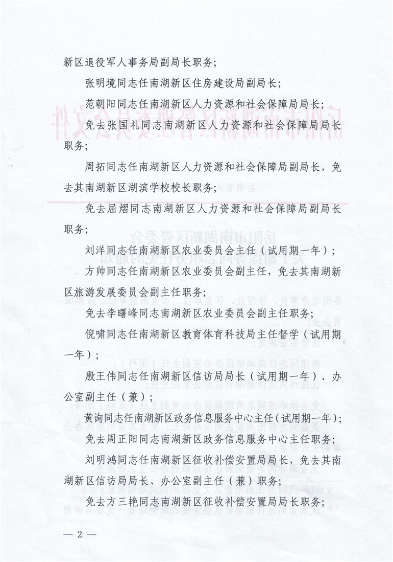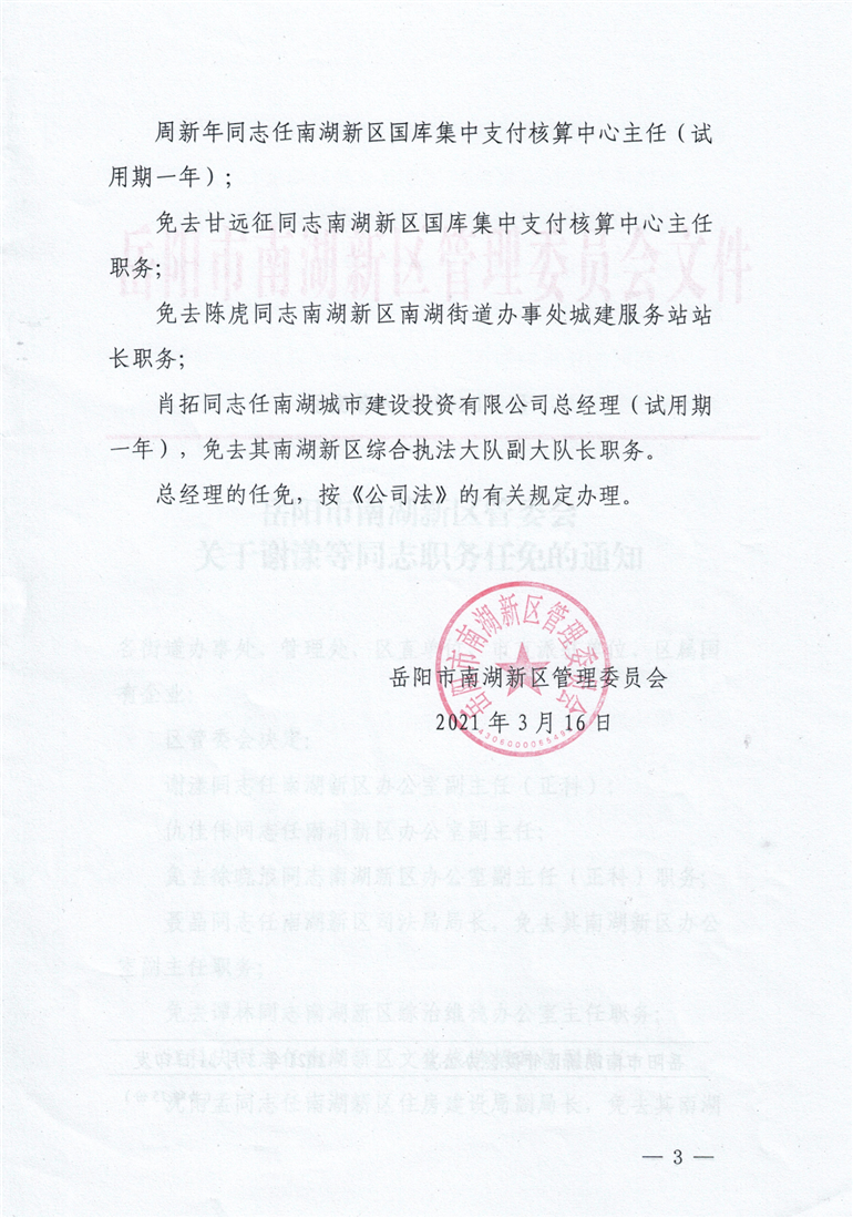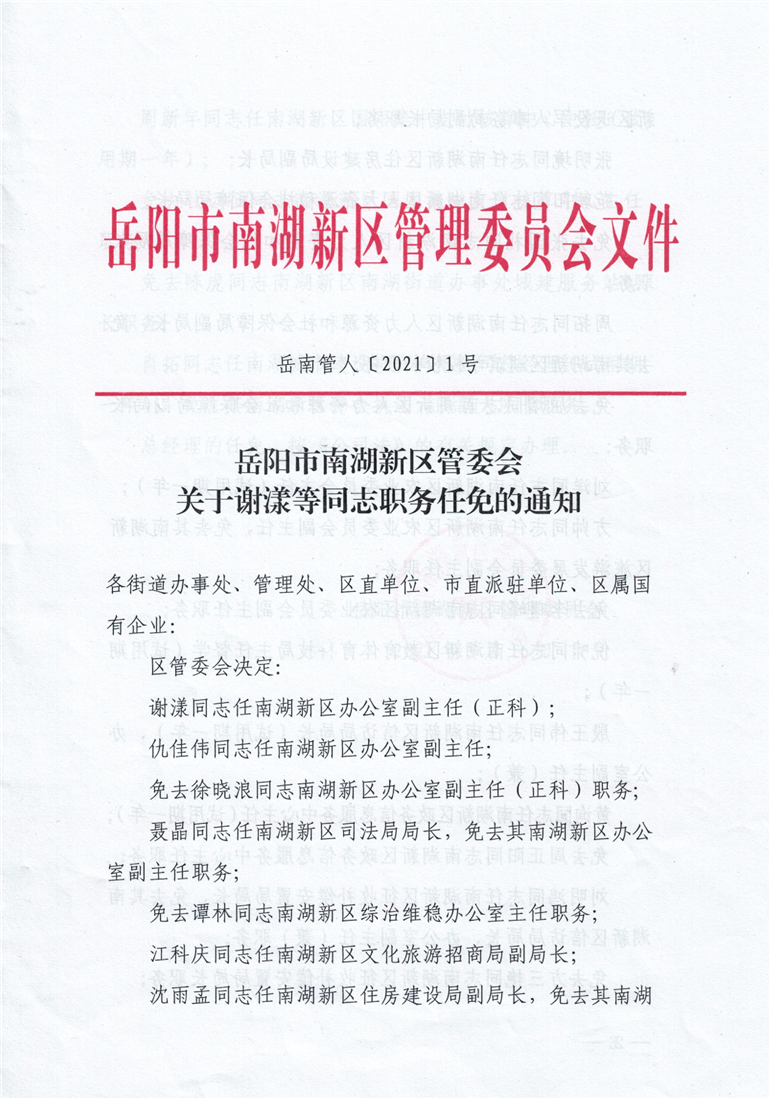 岳阳市南湖新区管委人关于谢漾等同志职务任免的通知