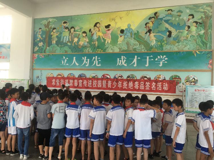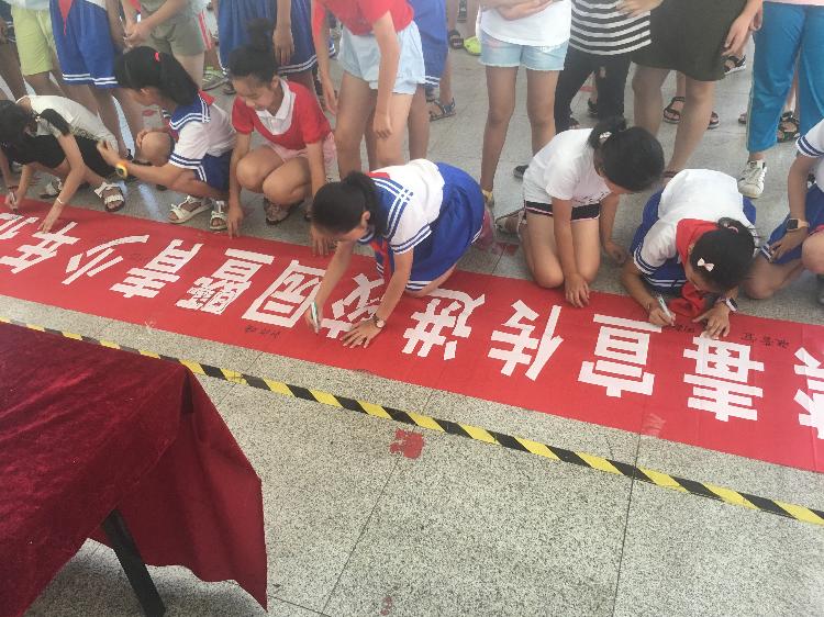 金鹗小学学生在禁毒宣传横幅签上自己的名字