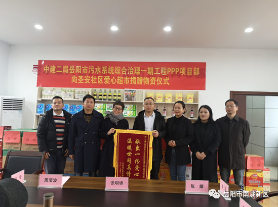 11月28日,寒意阵阵。上午9时,中建二局岳阳市污水系统综合治理一期工程PPP项目部向圣安社区爱心超市捐赠物资仪式举行。项目部带来价值1万元的生产生活用品,向圣安社区爱心超市捐赠。月山管理处、圣安社区相关负责人参加。