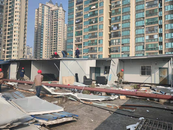 “一、二、三,加把劲儿....”伴随着执法大队整齐的口号声,又一个违章建筑被拆除。11月29日,求索街道综合执法大队、云梦社区,对香洲路酷奇KTV顶楼的违章建筑——临时活动板房开展拆除行动。
