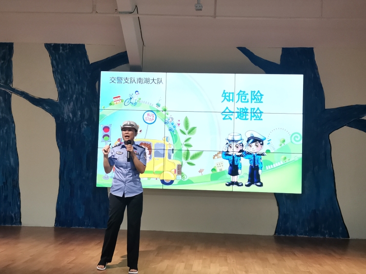 交通安全教育从小抓起,让幼儿对交通规则有最初的认知,懂得遵守交通规则的重要性,是幼儿园一门必修的课程。为全面普及师幼交通安全知识,进一步增强幼儿的交通安全意识、提倡文明出行,提高幼儿应对突发交通安全事故及自我保护能力,确保幼儿入园、离园路上的交通安全,6月6日,宏润家园幼儿园邀请南湖新区交警大队的邹可、陈双、李涛警官入园,为全体师幼开展了一场生动的“知危险会避险”交通安全主题活动。