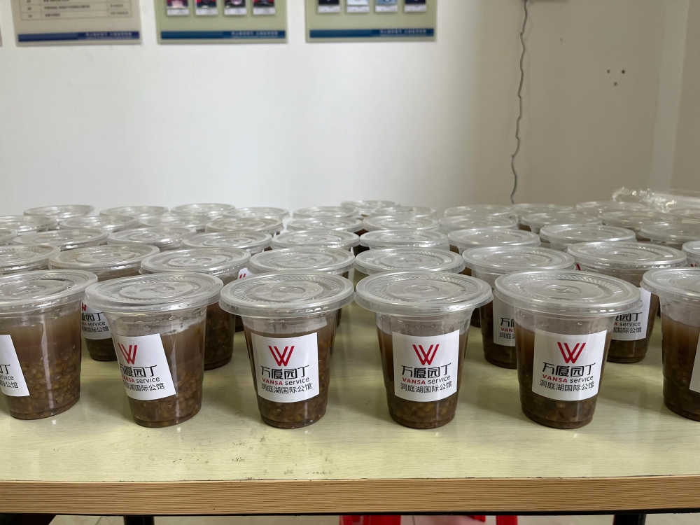 活动当天一大早,万厦园丁物业员工便早早来到点上忙碌起来,先将绿豆、西米一起清洗,淘干净,然后清洗锅盆、烧水、煮绿豆、西米,随后慢慢熬炖,精心熬制大约3个小时,新鲜绿豆西米粥就出锅了,打开锅盖的一瞬间,一阵阵绿豆香扑面而来,看着清澈的淡绿色西米粥汁让人垂涎三尺。待绿豆西米粥自然冷却后,将其舀在预先准备好的携带杯子里。