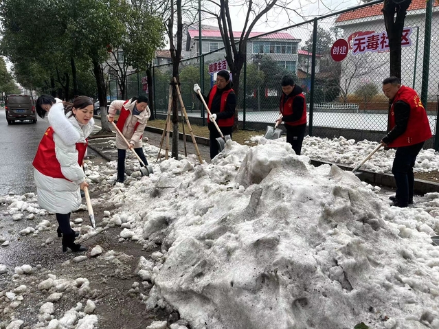 寒潮已过,大部分积雪已经融化,但部分背阳区域和道路两侧体积较大的残存冰雪难以消融,不仅影响美观,还给居民出行造成不便。2月29日,岳阳市南湖新区龙山管理处黄梅港社区组织了由党员志愿者、居民志愿者参与的社区环境整治活动。