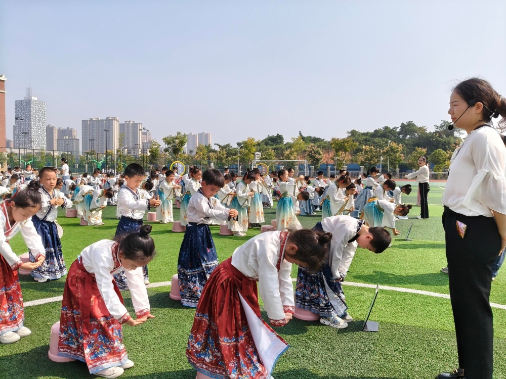 仪式在庄严的诵读声中拉开序幕。学生代表熊景毅带领全体一年级同学齐声诵读孔子经典语录,朗朗童声回荡在校园上空,传递出对先贤的敬仰与对知识的向往。随后,孩子们在老师的示范下“正衣冠”,并向老师行拜师礼:“一拜老师,教我读书;再拜老师,教我做人;三拜老师,永世不忘。”稚嫩的动作中饱含着对师长的尊敬与感恩。