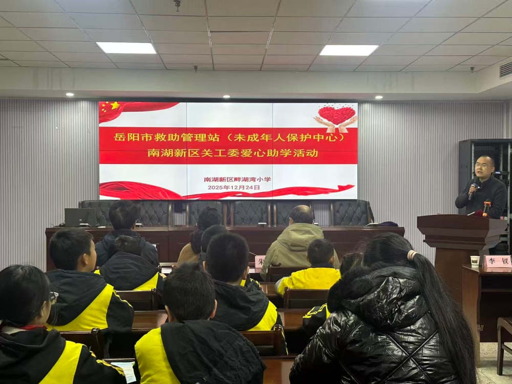 12月24日上午9时,岳阳市南湖新区畔湖湾小学校园内暖意融融,驱散了冬日的寒意。一场由岳阳市救助管理站(市未成年人保护中心)与南湖新区关心下一代工作委员会联合主办的“爱心助学”活动在此举行,为困境儿童送去温暖与关怀。市救助管理站副书记夏青、南湖新区关工委主任张朝东、区教体科技局副局长李钗等出席活动。