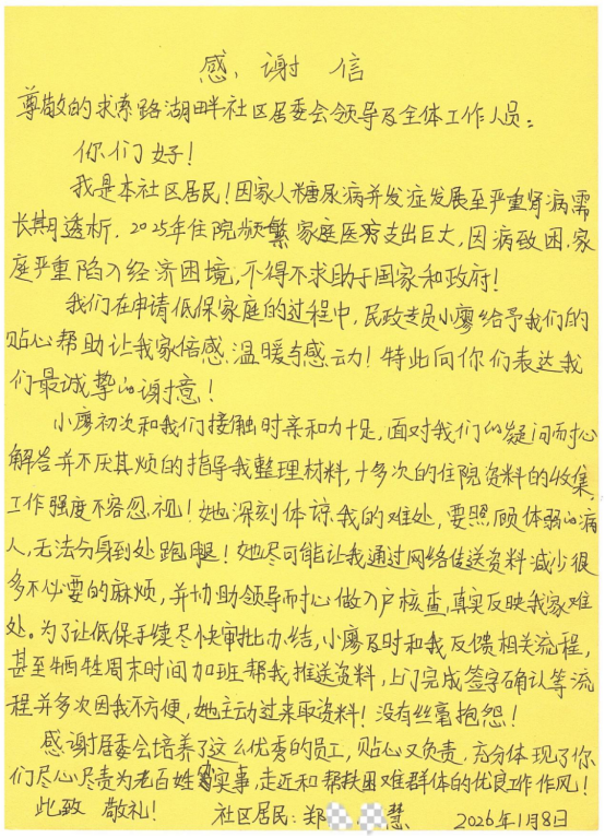 1月15日,湖畔社区收到一封来自居民的感谢信。字里行间满是对社区民政专员的真挚谢意。信中写道:“在申请低保的过程中,社区民政专员小廖给予我们的贴心帮助让我家倍感温暖和感动!感谢居委会培养了这么优秀的员工,贴心又负责,充分体现了你们尽心尽责为老百姓办实事,走近和帮扶困难群体的优良工作作风。”