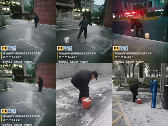 早在上周㴩湖社区收到街道下发天气预报预警雨雪天气,便在小区业主微信群等渠道发布天气预警信息与出行安全提醒以及用火用电用气事项,详细告知低温冰冻天气注意事项。小区党支部、业委会成员便主动联系物业开展前期防控,准备应急物资,提前备足融雪盐、铁锹、手套等除冰物资,明确各出入口、重点区域的防控责任,为快速处置结冰隐患做好充分准备。