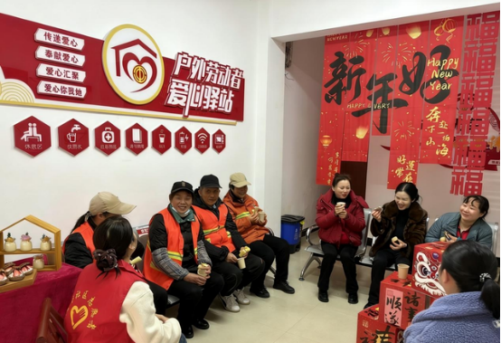 2月24日,正值开工吉日,湖畔社区暖心驿站氛围满满。墙上悬挂长条福字,搭配精致立体摆件,处处洋溢喜庆气息。驿站吧台上摆满精致甜品、水果。志愿者热情邀请辖区户外劳动者齐聚一堂,共迎开工。