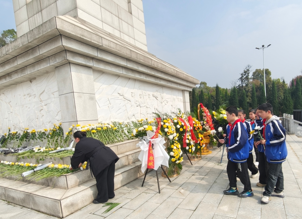 迎着春日清风,徒步队伍在学校操场集结,党支部作动员,明确此次徒步既是体能历练,更是致敬英烈、淬炼信念的红色征程。出发指令下达后,师生队伍整齐启程,党员教师在前引领、分段值守,少先队员精神昂扬、队列严整,无一人掉队。行进中,党员教师为孩子们讲述张超烈士为舰载机事业牺牲、诠释忠诚与初心的事迹。鲜活故事让孩子们明白,前行是对英烈奋斗的致敬,坚持是对英烈精神的传承。数公里徒步后,师生抵达岳阳市烈士陵园,全体庄严肃立默哀,依次敬献黄白菊花,将敬意与哀思化作对英烈的郑重致敬。