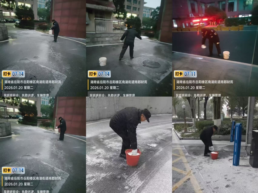 1月20日气温降至冰点以下,强冷空气携雨雪来袭,南郡财苑小区路面湿滑结冰,给居民出行带来极大安全隐患。为筑牢冬日安全防线,应急管理局联合㴩湖社区、南郡财苑小区党支部、业委会、物业、“三长”多方紧密配合,提前筹备,全力保障居民们冰雪天气道路交通安全。