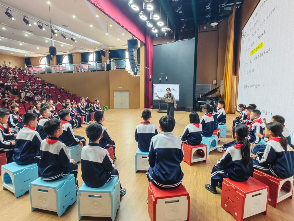 本次活动紧扣“强基工程”建设与“双新”教学转型要求,打造高质量音乐教研交流平台。现场,学校5个班级的学生携手执教教师,呈现5节特色鲜明的音乐优质展示课,为参会教师提供可借鉴的教学范例;AI 赋能教学创新专题交流环节,与会人员深入探讨人工智能与音乐课堂的深度融合路径,为学科数字化转型赋能。此外,学生带来的课前手势操、葫芦丝会前演出,充分展现艺术素养,成为活动亮点,获现场一致好评。