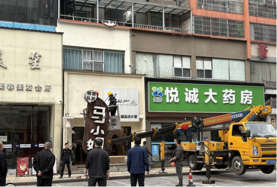 拆除现场秩序井然,施工人员布设警戒、配齐防护装备,利用切割、吊装设备拆解移除老旧广告牌,及时清理建筑垃圾,最大限度减少居民生活、商户经营受到的影响,整个作业安全高效。