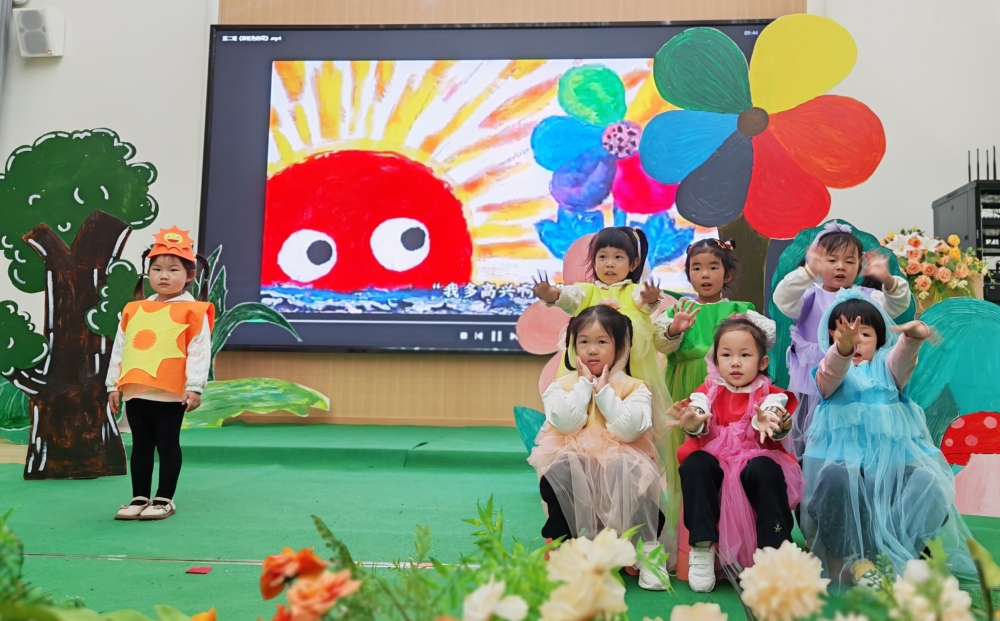 小班组萌态可掬,豆一班带来经典故事《小蝌蚪找妈妈》,孩子们在曲折寻亲的剧情中,用稚嫩的表演诠释了勇敢与坚持;豆二班温情呈现《彩虹色的花》,小朋友们化身花瓣与小动物,在举手投足间传递分享与互助的美好品格,赢得阵阵掌声。