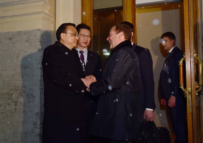 当地时间11月7日,正在俄罗斯圣彼得堡访问的李克强总理与俄总理梅德韦杰夫在康斯坦丁宫举行中俄总理第二十一次定期会晤、出席签字仪式并共同会见记者等。密集的活动从中午1点一直持续到晚上7点多。两位“老友”在风雪夜中亲切话别,并约定来年北京再见。