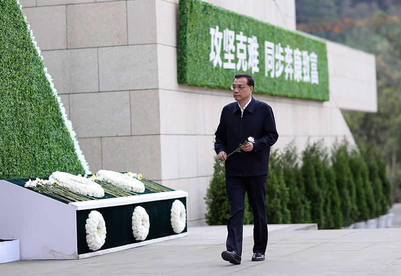 三年后,李克强再来芦山,4月24日首先前往祭奠遇难同胞和抗震救灾中英勇献身的烈士。李克强缓步走上台阶,俯身轻轻把一支鲜花放在“4?20”芦山强烈地震纪念馆前的纪念台上。台面镌刻着196名遇难同胞的姓名。总理在纪念台前深深鞠躬,默哀一分钟。现场肃穆,哀思凝重。