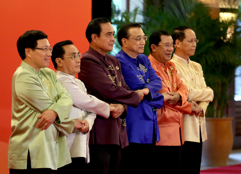 3月22日,李克强总理在海南三亚欢迎来华出席澜沧江—湄公河合作首次领导人会议的泰国、柬埔寨、老挝、缅甸和越南五国领导人,与他们握手并合影留念。2014年,李克强在第17次中国—东盟领导人会议上提出,在中国—东盟(10+1)框架下探讨建立澜湄对话合作机制。