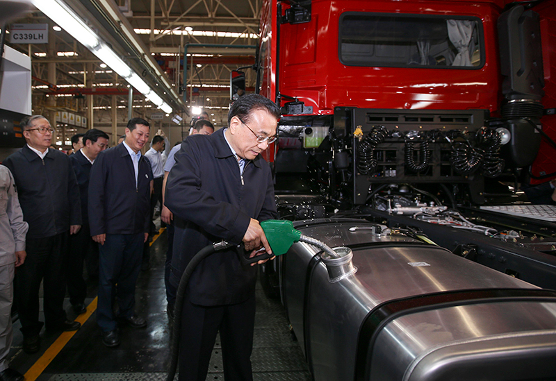 5月23日,在东风商用车重卡新工厂,李克强总理为装配线上一辆红色重型卡车的油箱加满了油。