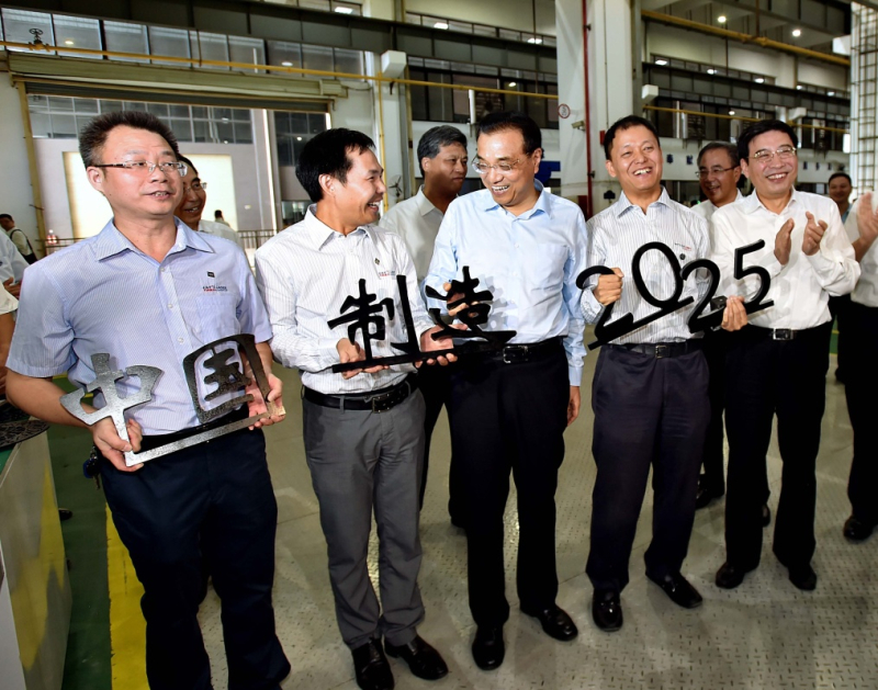 10月13日,深圳大族激光车间内,一个激光切割的“中国制造”字样送到李克强手里。总理仔细端详说,工艺很好不过应加上“2025”。工人笑答已做出来了,并端着它与总理合影。李克强鼓励员工,“中国制造2025”大有希望,要在你们手上大放光芒。