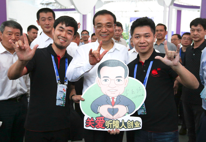 10月12日下午李克强总理来到全国双创周深圳主会场。在一位听障创业团队负责人示范下,总理也打出“爱”的手势。李克强对这一创业团队给予特殊关注,并应邀在“关爱听障人创业”画板上签上自己的名字。