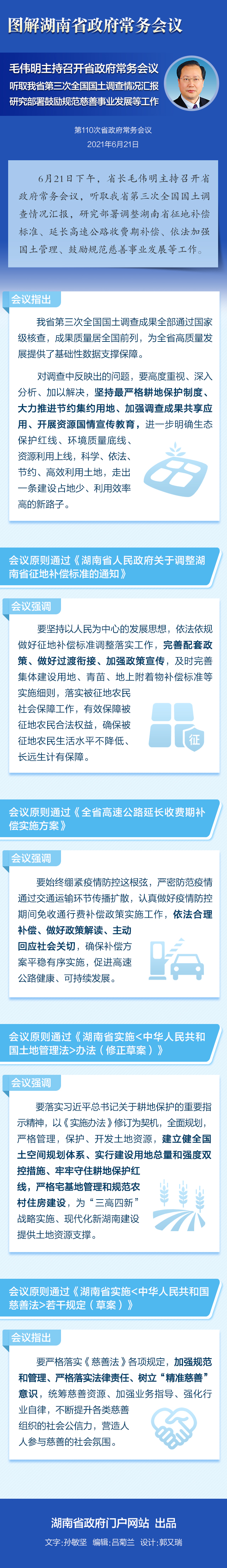 6月21日下午,省长毛伟明主持召开省政府常务会议,听取我省第三次全国国土调查情况汇报,研究部署调整湖南省征地补偿标准、延长高速公路收费期补偿、依法加强国土管理、鼓励规范慈善事业发展等工作。