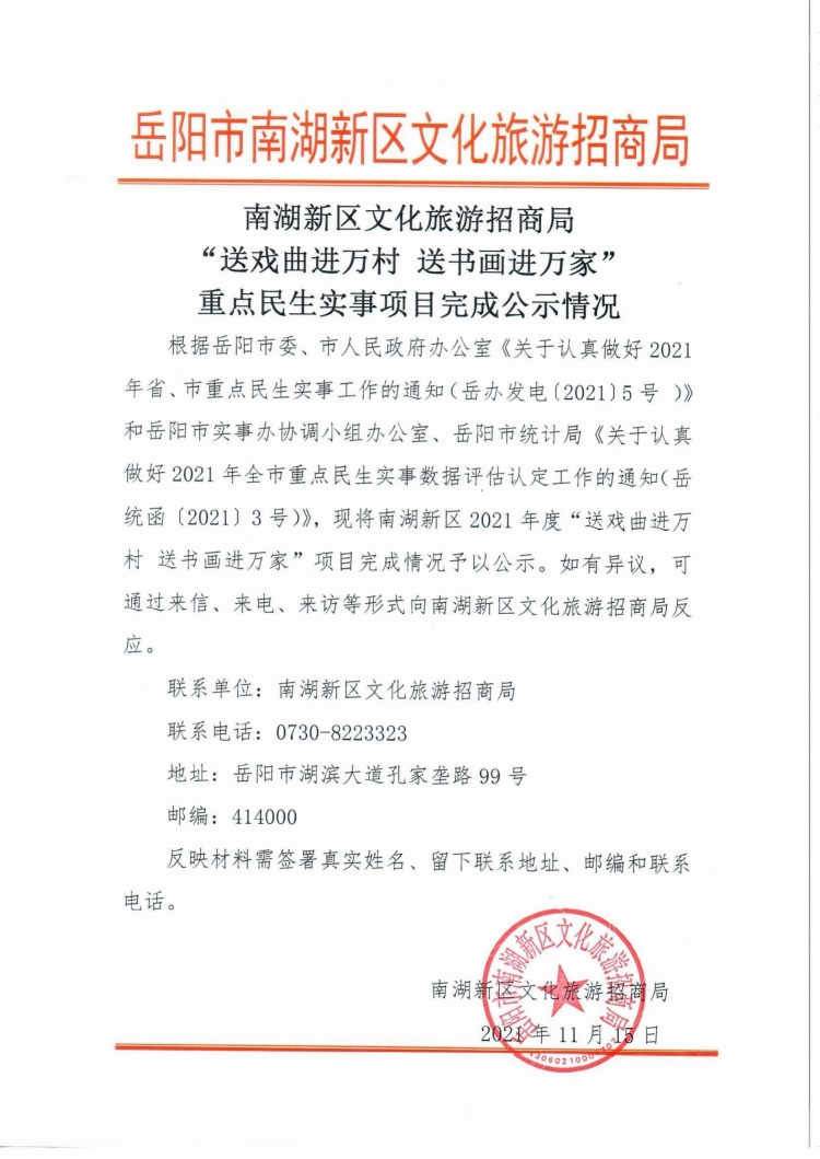 南湖新区文化旅游招商局“送戏曲进万村 送书画进万家”重点民生实事项目完成公示情况