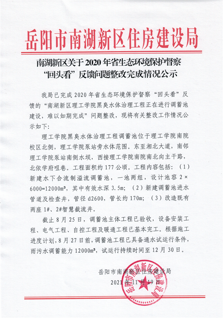 南湖新区关于2020年省生态环境保护督察“回头看”反馈问题整改完成情况公示