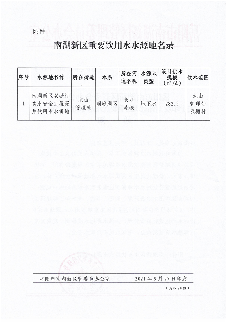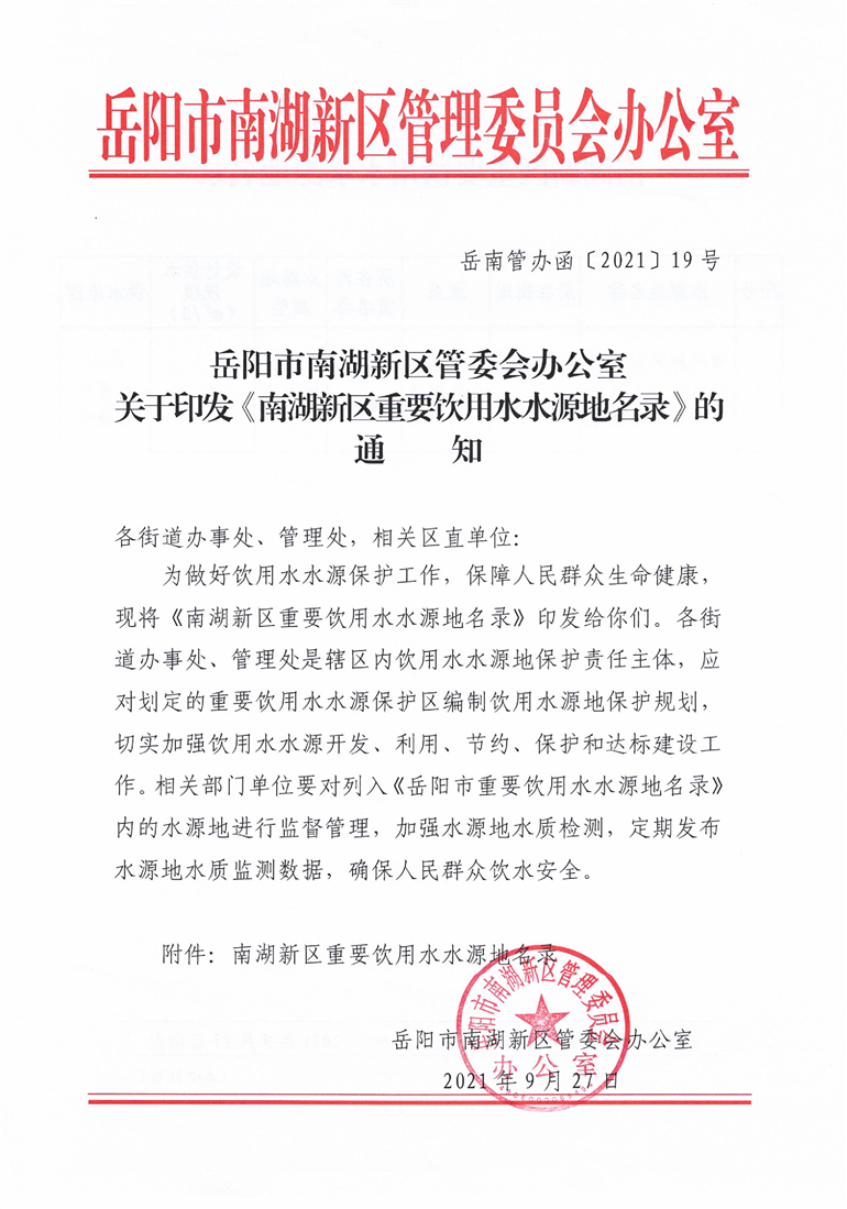 关于印发《岳阳市南湖新区重要饮用水水源地名录》的通知(岳南管办函〔2021〕19号)