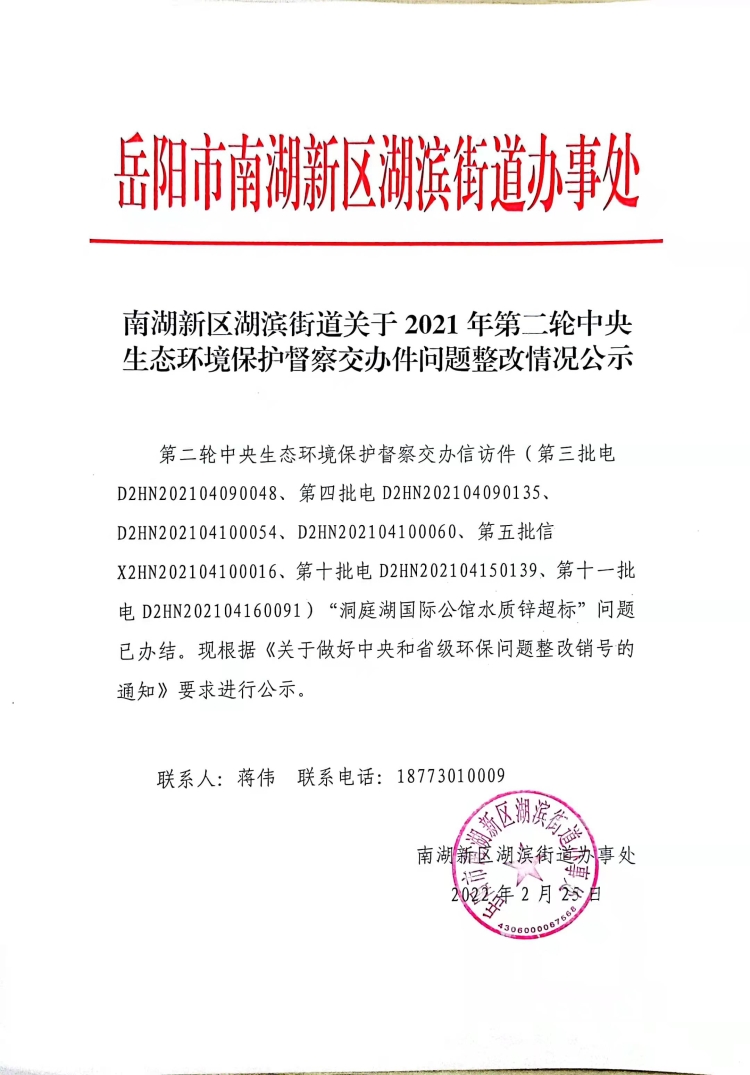 南湖新区湖滨街道关于2021年第二轮中央生态环境保护督察交办件问题整改情况公示
