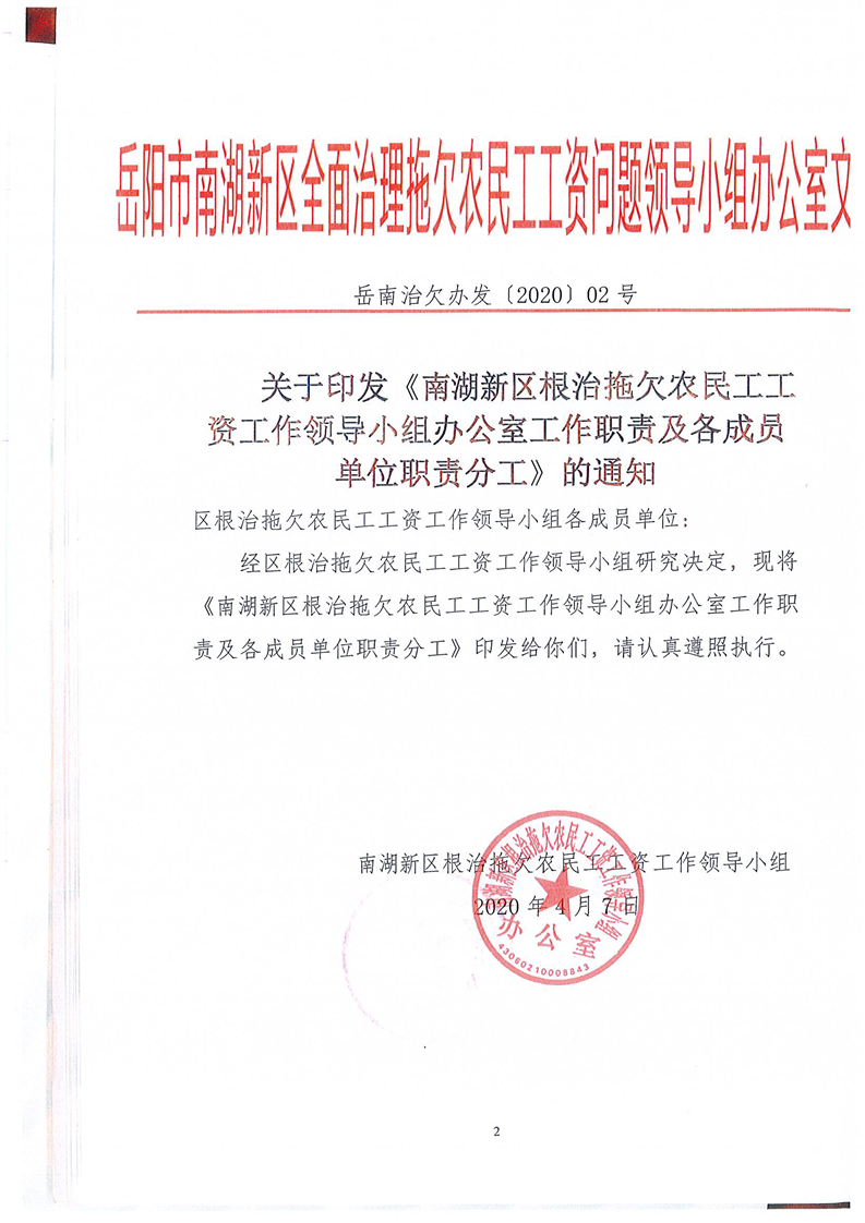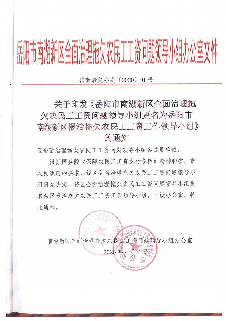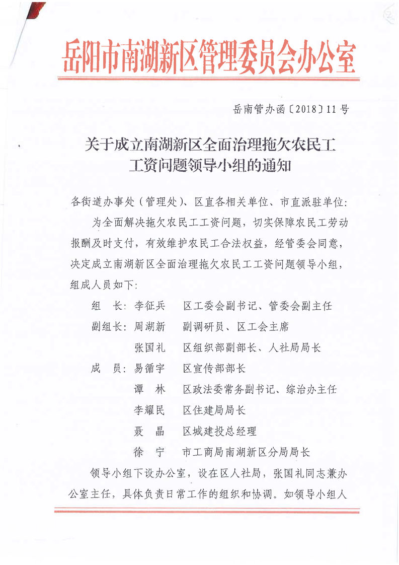 关于建立南湖新区保障农民工工资问题领导小组的公告