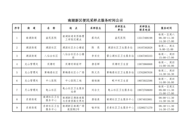 为进一步织牢织密疫情防护网,方便辖区居民随时随地进行常态化核酸检测,岳阳市南湖新区开放应检尽检便民服务采样点9处,现将采样点位置、联系电话、采样时间公示如下: