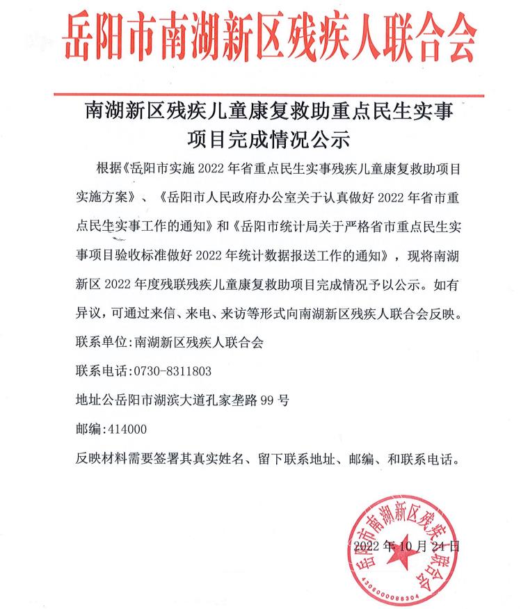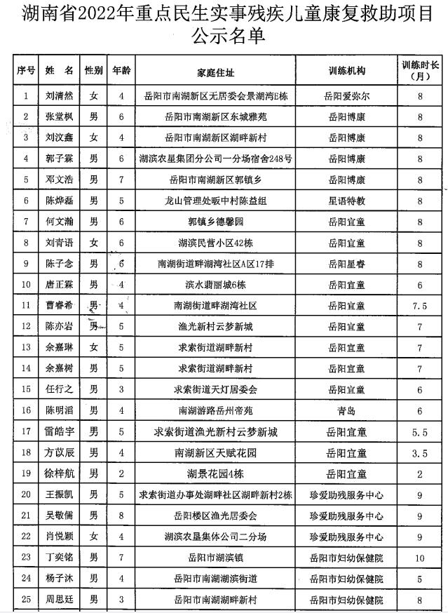 南湖新区残疾儿童康复救助重点民生实事项目公示
