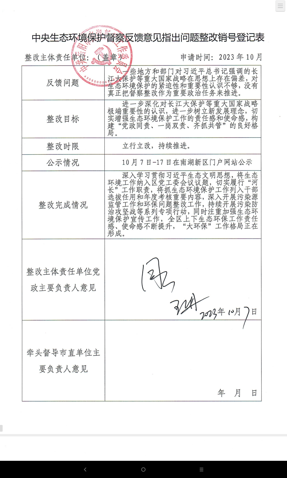 中央生态环境保护督察反馈意见指出问题整改销号登记表