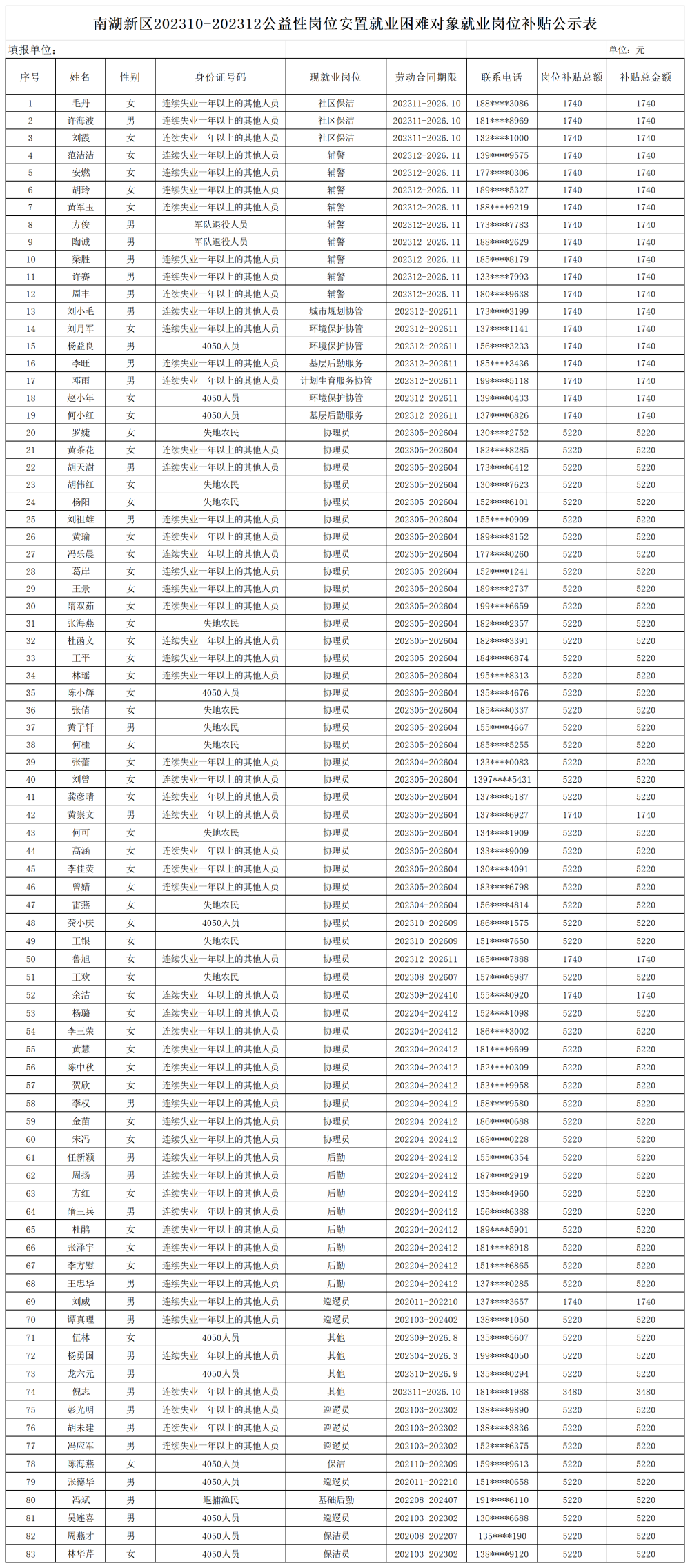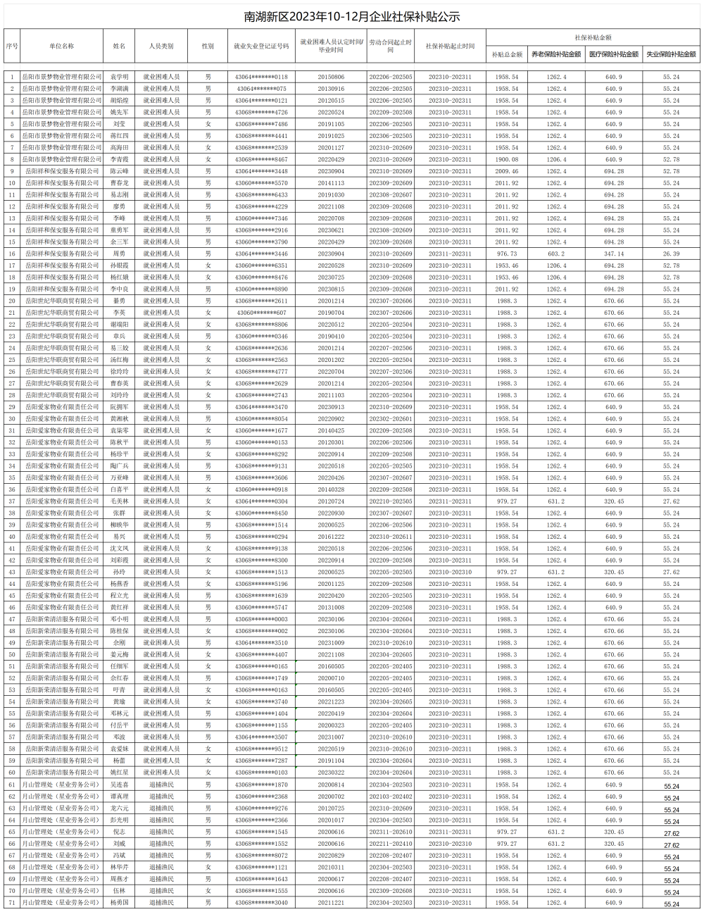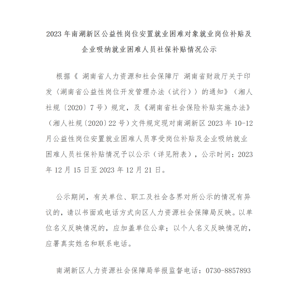 2023年南湖新区公益性岗位安置就业困难对象就业岗位补贴及企业吸纳就业困难人员社保补贴情况公示