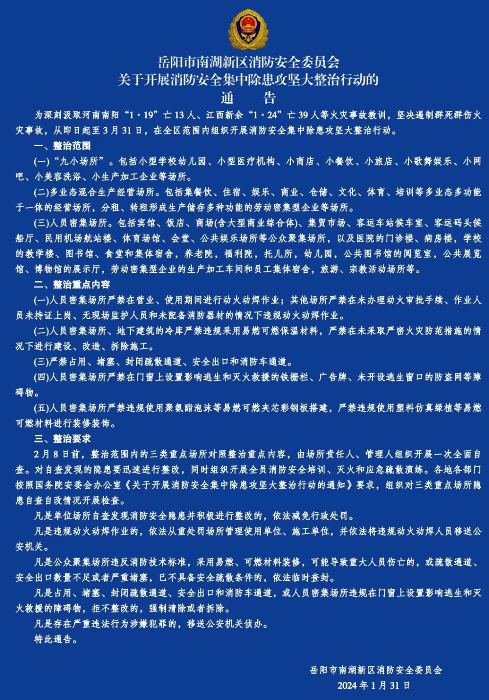 关于开展消防安全集中除患攻坚大整治行动的通告