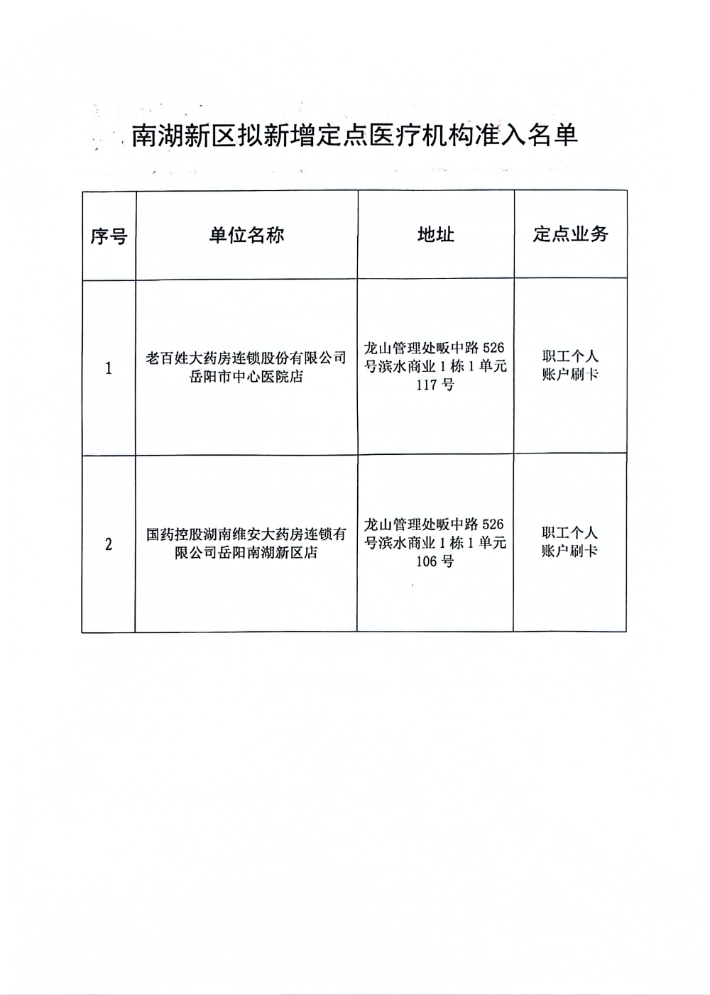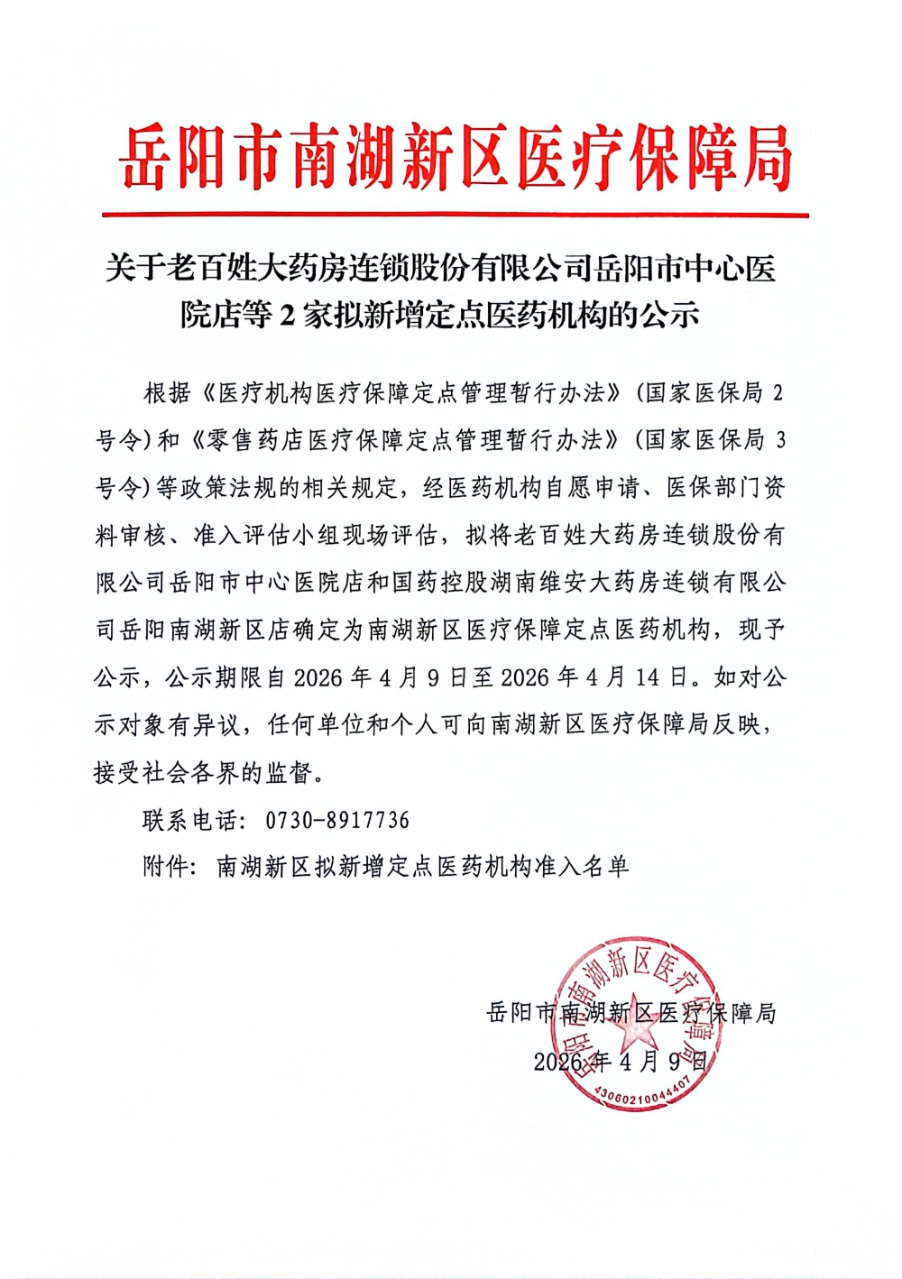 关于老百姓大药房连锁股份有限公司岳阳市中心医院店等2家拟新增定点医药机构的公示