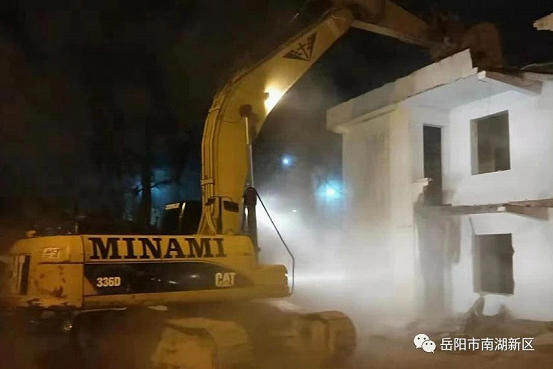 经挖掘机两个小时的紧张作业,于晚上21时将一栋两层建筑面积300余平方米的空心房全面拆除;四台重载自卸车也在凌晨1点前将所有建筑垃圾清运完毕。现场的洒水、路面保洁同步进行,到3月12日早上7点任务全面完成。