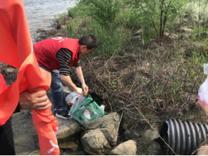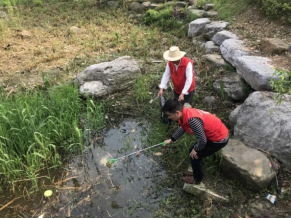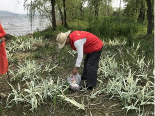 志愿者们各司其职,天气虽然炎热,不怕脏不怕累,在沿湖的草丛中拾垃圾,云梦社区志愿者李洪兵说:“夏天快来了,有不自觉的居民会跑到湖边来钓鱼,一经发现要及时制止。”