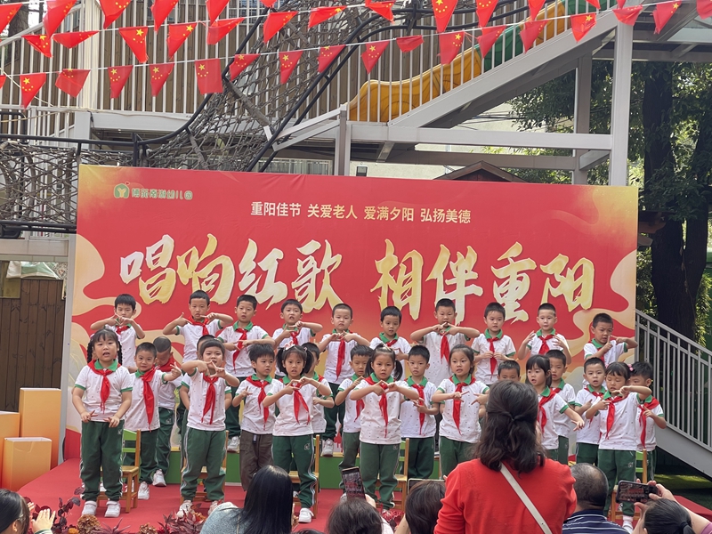 百善孝为先,孝敬是根本,一曲爱国赞歌,一份深情的告白,在我们咿呀学步的时候,爷爷奶奶为我们付出了毕生的精力,我们唯有孝顺他们,关爱他们,才能报答他们的恩情。接下来是红歌合唱节目,分别是果A班小朋友带来的《童心向党》、朵B班演绎《红星闪闪》、苗A班《国旗国旗多美丽》、果c班大合唱《中国》以及朵A班带来的《中国少年先锋队》,爷爷奶奶的到来让孩子们欣喜不已,舞台上的他们更是活力四射、神采奕奕,人小志气大的壮志情怀赢得全场爷爷奶奶们的喝彩,孩子们用歌声表达对祖国妈妈热爱的同时,也将自己的成长作为献给爷爷奶奶们的最好的节日礼物。红歌润童心,它不仅是中国革命历史真实的写照,也将永远激励着我们每个中国人发奋图强、勇往直前。
