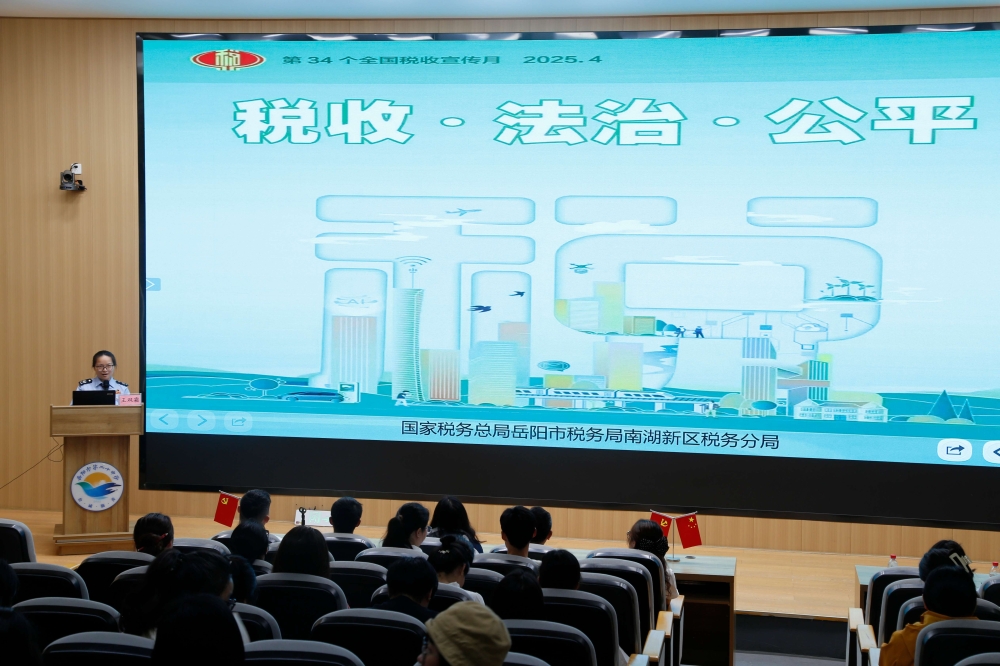 在第三十四个全国税收宣传月之际,国家税务总局岳阳市南湖新区税务分局紧扣“税收 法治 公平”主题,于2025年4月21日组建由税源管理一股股长文明带队的专家团队,走进岳阳市第二十中学开展“个税政策进校园”专项辅导活动,为百余名教职工送上量身定制的税收政策“辅导课”。
