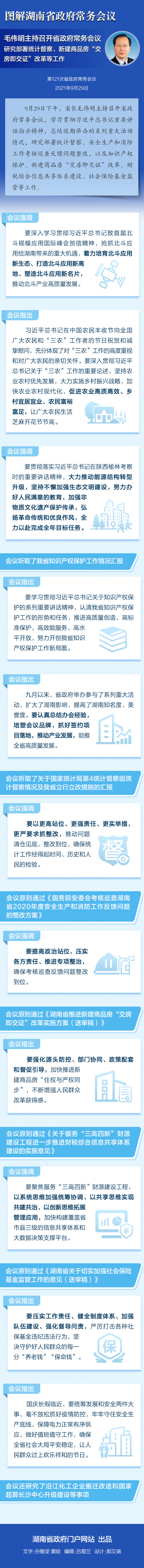 9月29日下午,省长毛伟明主持召开省政府常务会议,学习贯彻习近平总书记重要讲话指示精神,总结近期举办的系列重大活动情况,研究部署统计督察、安全生产和消防工作考核巡查反馈问题整改,以及知识产权保护、新建商品房“交房即交证”改革、财税综合信息共享体系建设、社会保险基金监管等工作。