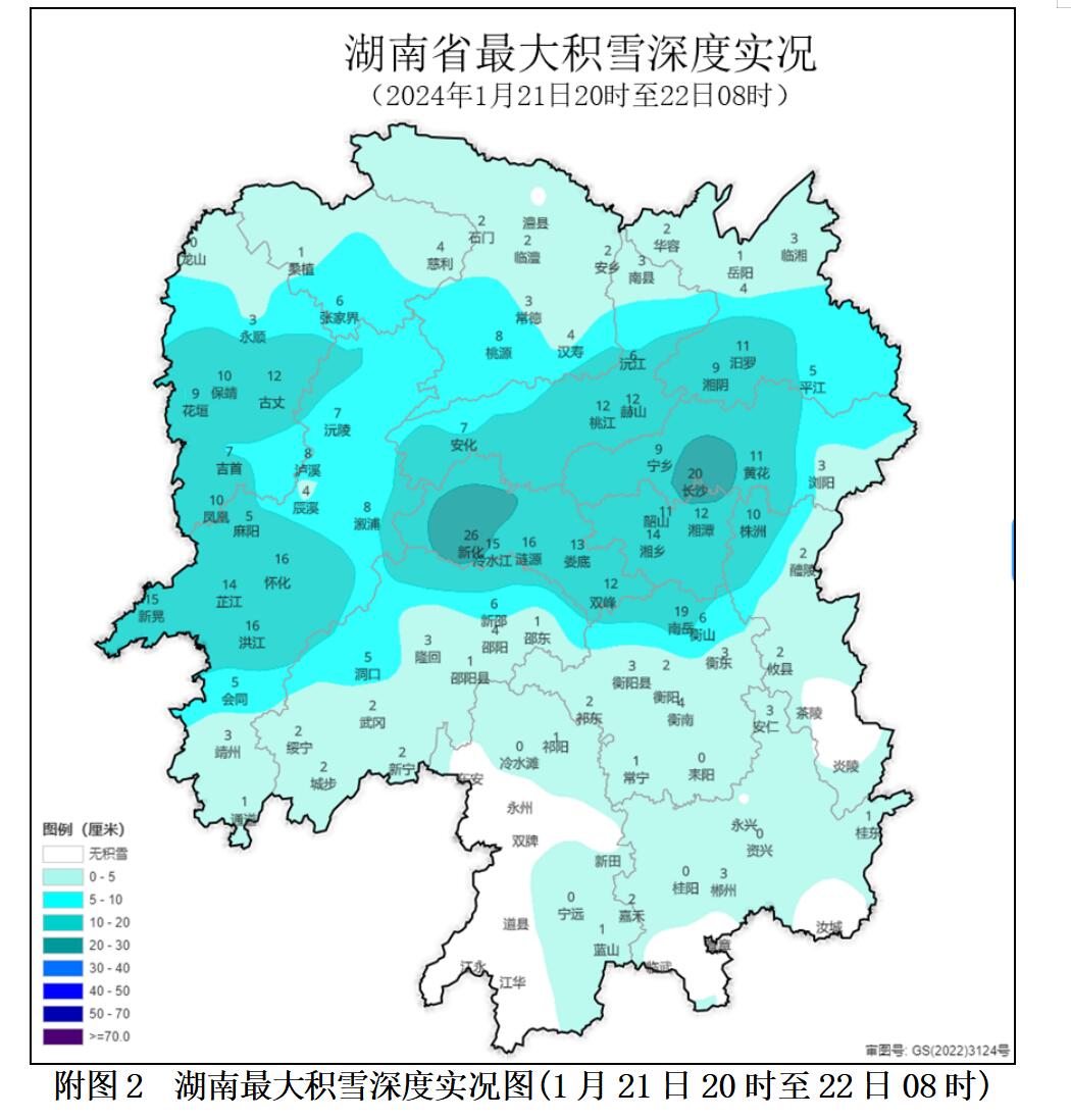 湘西州、怀化、张家界南部、常德南部、娄底、益阳、长沙、岳阳南部、湘潭、邵阳北部、衡阳北部的35个县市区积雪超过5厘米,其中19个县市区超过10厘米,新化最大为26厘米;邵阳、永州、郴州、衡阳、株洲局地出现1~3毫米电线积冰。