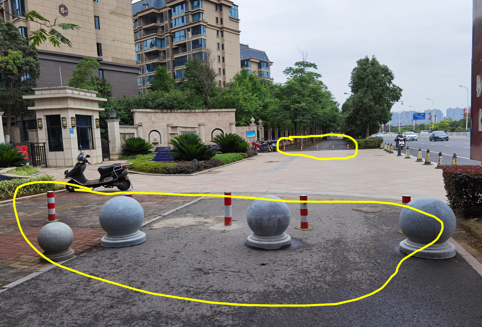 南湖壹号小区湖滨大道沿线,小区大门口和小区好又多超市旁,人行道和非机动车道人为非法设置警示柱和石墩,严重影响非机动车道和人行道的非机动车和行人的安全,其是否合法,安装是否有相关文件,没有的话,请相关部门尽快敦促拆除,保障行人和非机动车的安全。 附件1:大门口.png 附件2:好又多超市旁.png |